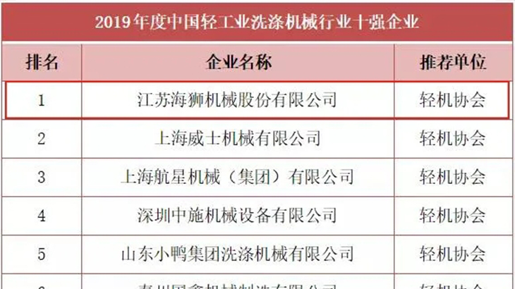 近日,中國輕工業(yè)聯(lián)合會揭曉了2019年度中國輕工業(yè)百強、輕工業(yè)裝備制造五十強、行業(yè)十強榜單,海獅機械榮登雙榜單。五十強年度中國輕工業(yè)裝備制造行業(yè)五十強榜單由中國輕工機械協(xié)會推薦的有22家企業(yè)榮登2019年度中國輕工業(yè)裝備制造行業(yè)五十強榜單,海獅機械排名第13位。行業(yè)十強年度中國洗滌機械行業(yè)十強榜單由中國輕工機械